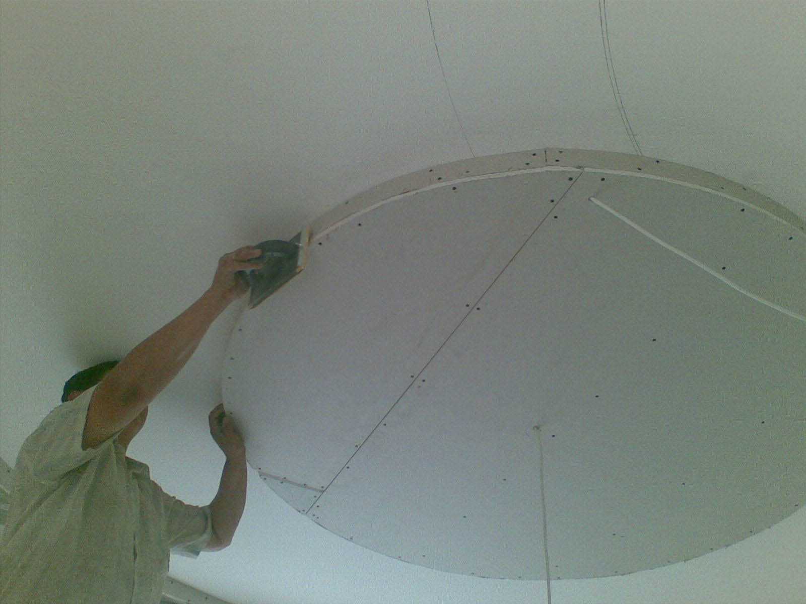 - Когда крепление подвесного потолка из гипсокартона завершено, все детали подогнаны друг к другу, а необходимые отверстия вырезаны, можно заняться шпаклевкой конструкции. Для этой работы обычно используется гипсовая штукатурка и клеящаяся сетка, которая предназначена для армирования стыков отдельных листов.