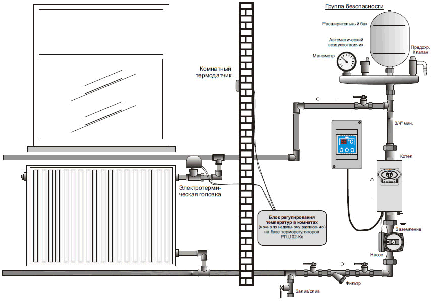 Простое управление обуславливается наличие встроенного блока управления, который позволяет настроить работу системы в зависимости от индивидуальных пожеланий. В блоке управления выставляется желаемая программа, которая будет поддерживать выбранный температурный режим. Например, при длительном отъезде можно включить режим ожидания, при котором в доме будет постоянно поддерживаться температура в 5 градусов.