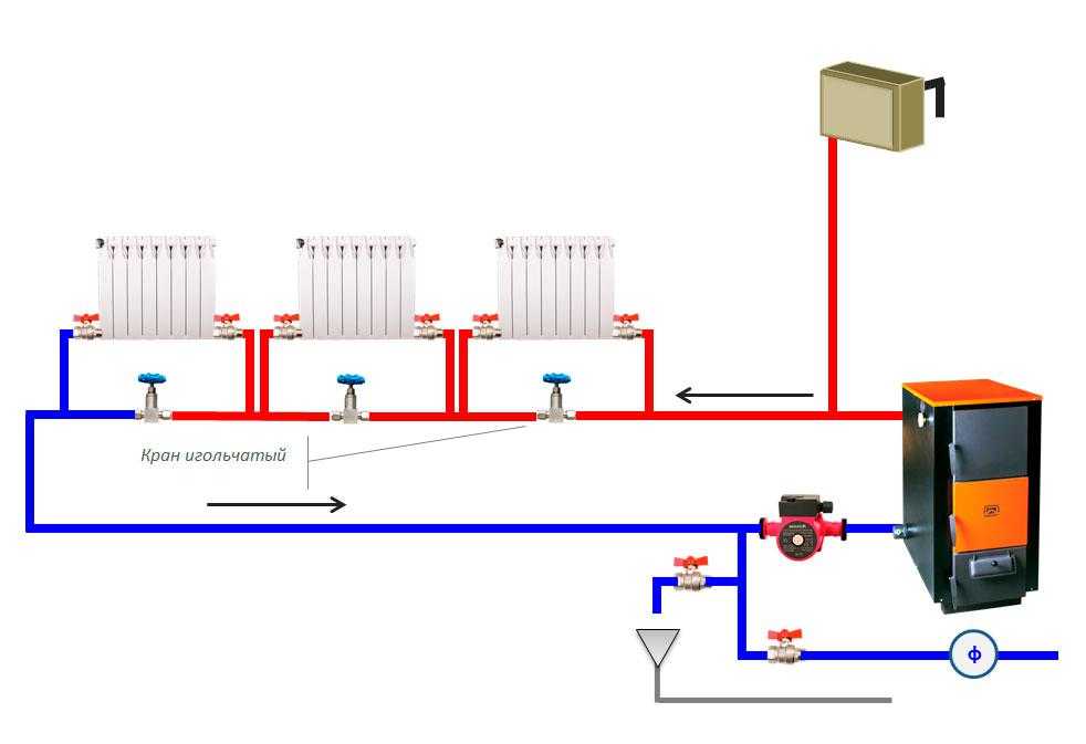 Как правило, для этих целей используется циркуляционный насос, но вполне подойдет и обычный центробежный, только малой мощности. Здесь мы можем неплохо сэкономить на трубах и добиться доставки тепла в каждое помещение.