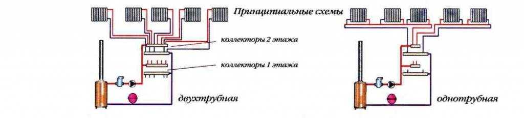 Схемы отопления в жилых домах частного сектора домостроительства являются тупиковыми двухтрубными системами отопления, однотрубные применяются редко.