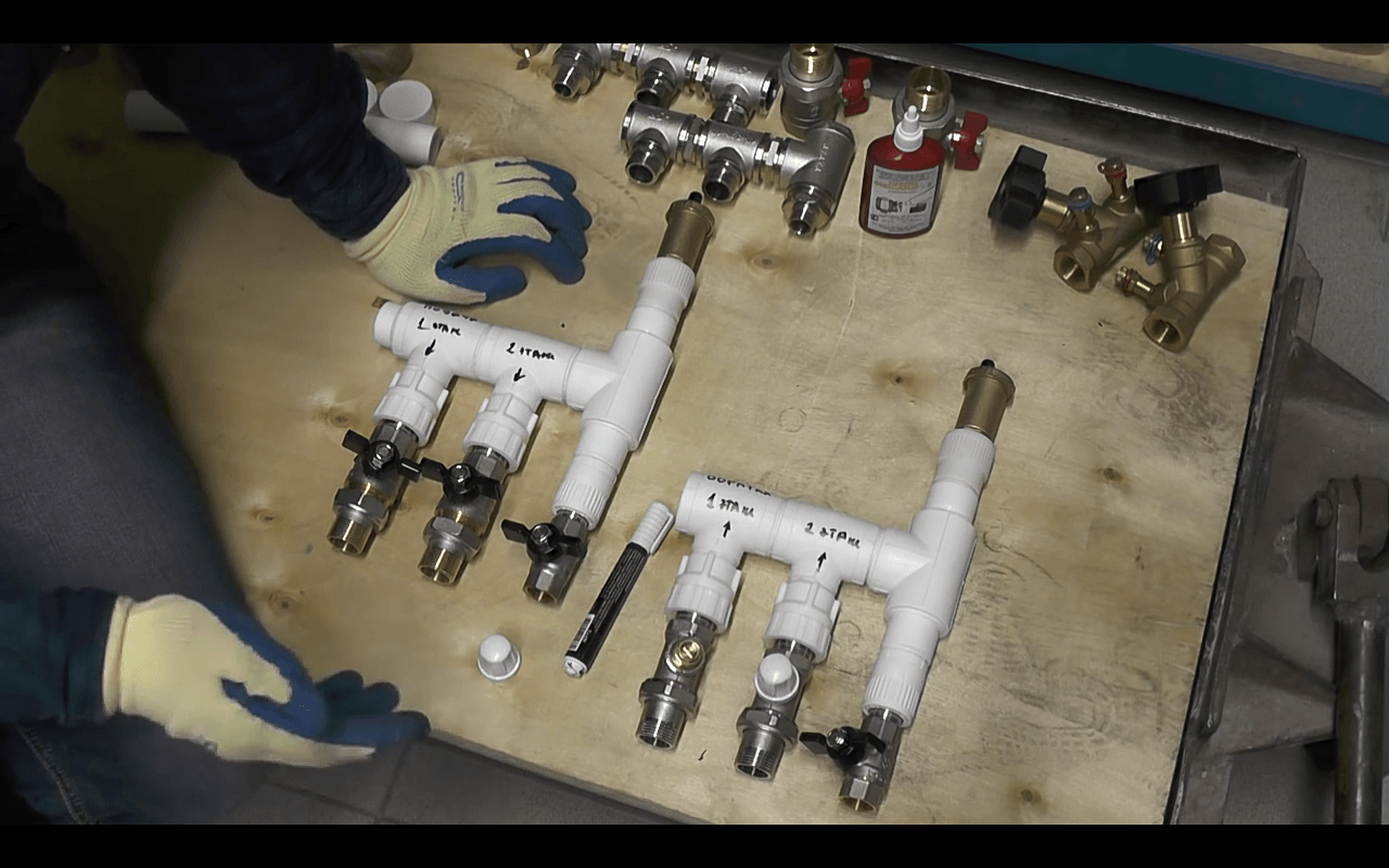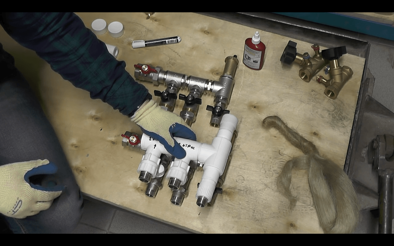 Когда смесительный узел будет установлен на штатное место и зафиксированным хомутами, останется только присоединить к нему со стороны насоса коллектор тёплого пола. Примечание! В данном случае мастер собирает эту часть конструкции из полипропилена, но так как у вас наверняка нет для него специального паяльника, можно использовать соединительную арматуру из латуни.