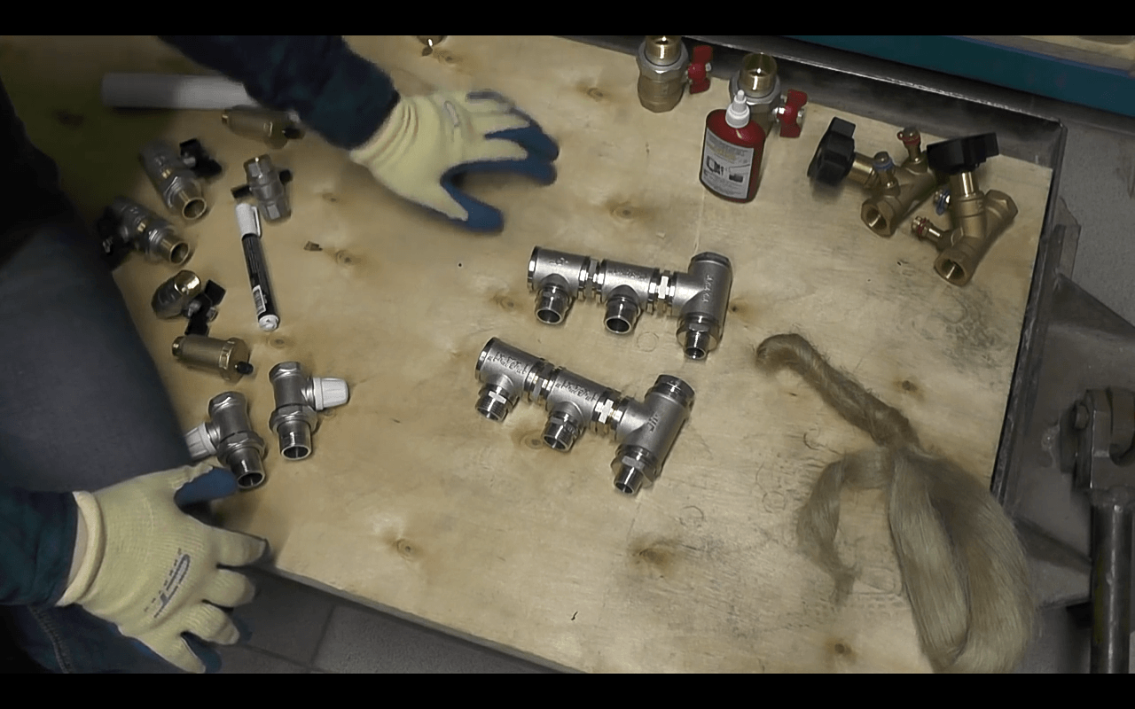 Для самостоятельного изготовления металлических гребенок используются латунные или бронзовые фитинги, тройники, футорки, заглушки. Общая схема и последовательность сборки напоминает аналогичный процесс для полипропиленовой гребенки, который лишь займает немного больше времени. Это связано с тем, что каждое резьбовое соединение предстоит тщательно герметизировать при помощи фумленты, льняной пакли или специальных герметиков.