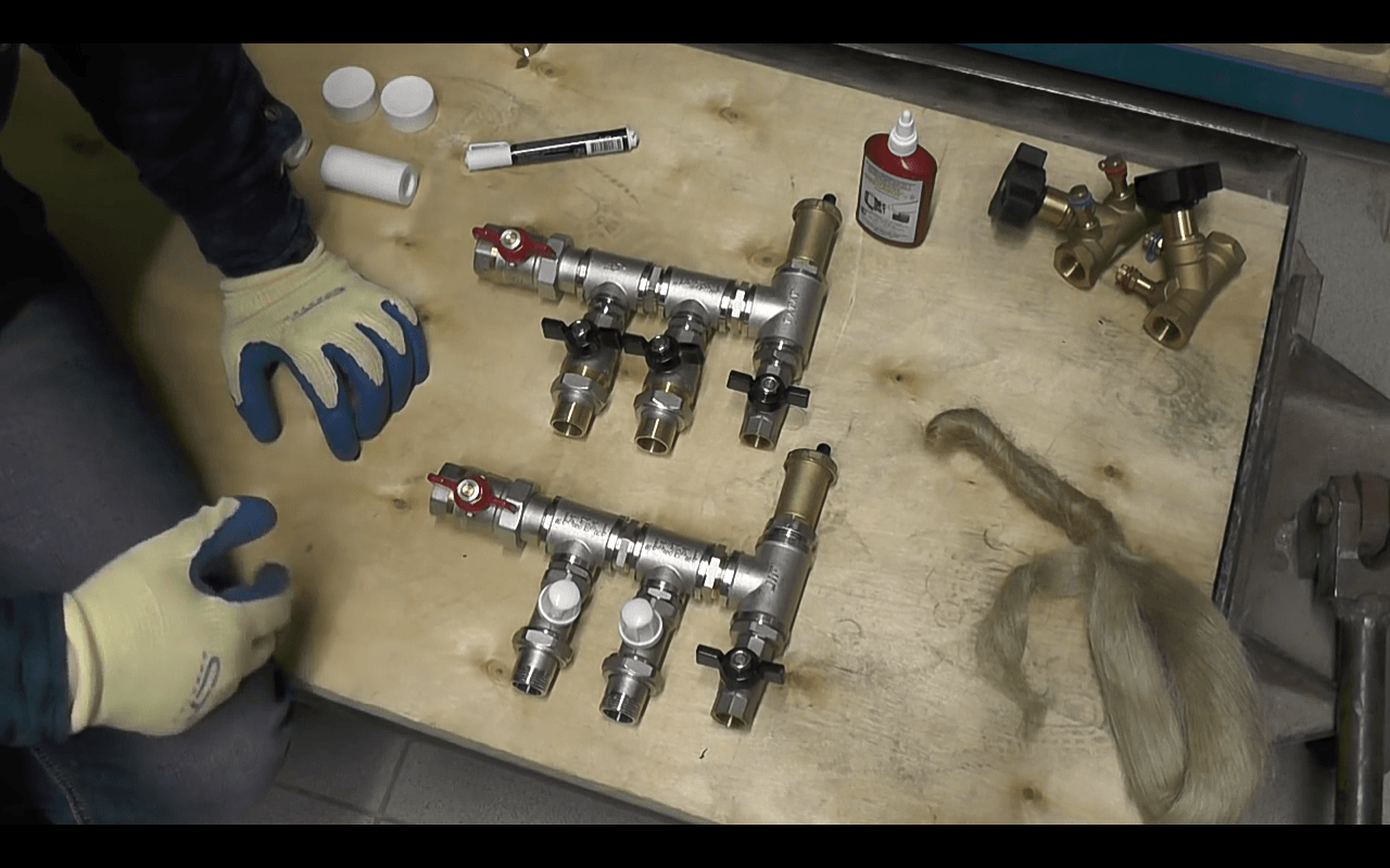 Вторым вариантом для сборки бюджетного коллектора это собрать его из латунных фитингов, тройников, футорок и т. д. Собирается такая система дольше полипропиленовой, так как каждое соединение нужно промотать фумкой, льняным волокном или специальным средством для герметизации резьбовых соединений. Такой вариант немного дороже первого, но смотрится он чуть симпатичнее, и занимает меньше места.