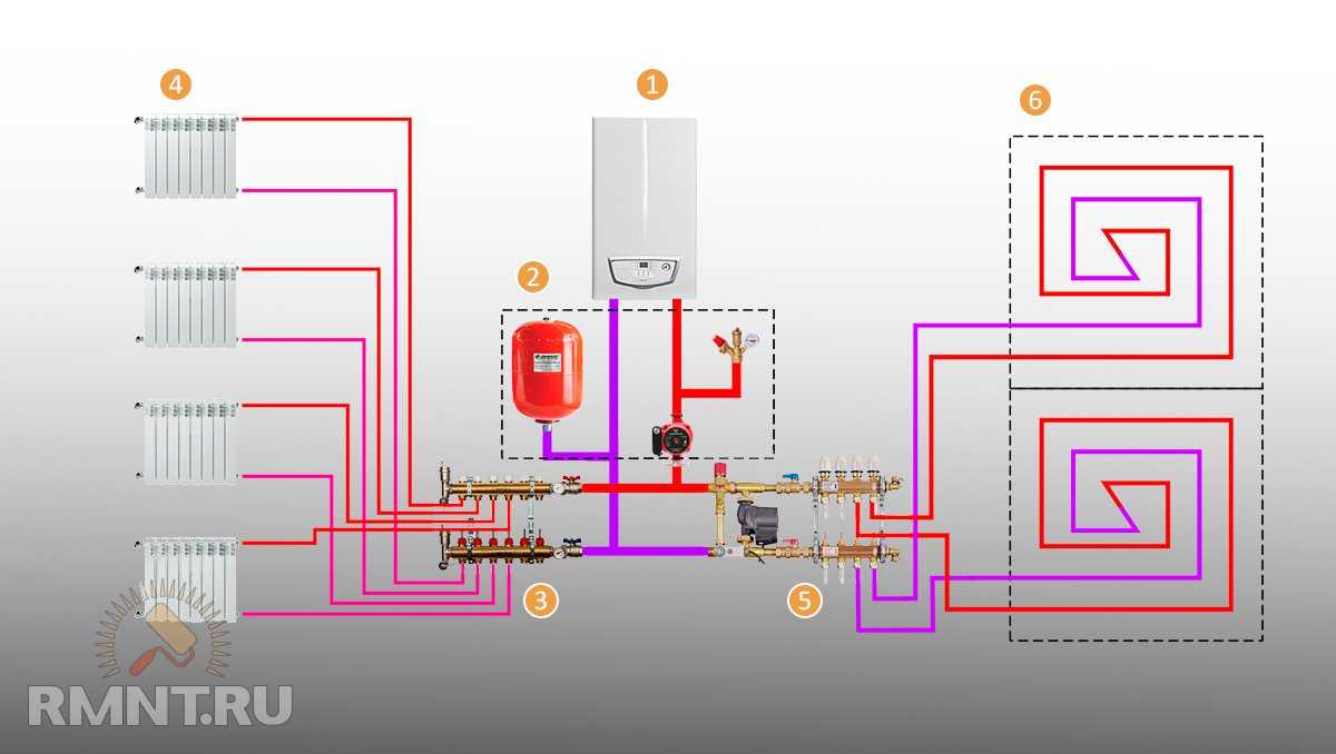 Типовая схема комбинированной системы отопления с подключением радиаторов и контуров тёплого пола. Это наиболее технологичный и легко настраиваемый вариант, но при этом требующий значительных начальных вложений. 1 — котёл отопления; 2 — группа безопасности, циркуляционный насос, расширительный бак; 3 — коллектор для раздельного двухтрубного подключения радиаторов по схеме «звезда»; 4 — радиаторы отопления; 5 — коллектор тёплого пола, включает в себя: байпас, трёхходовой клапан, термостатическую головку, циркуляционный насос, гребёнки для подключения контуров теплого пола с редукторами и расходомерами; 6 — контуры тёплого пола