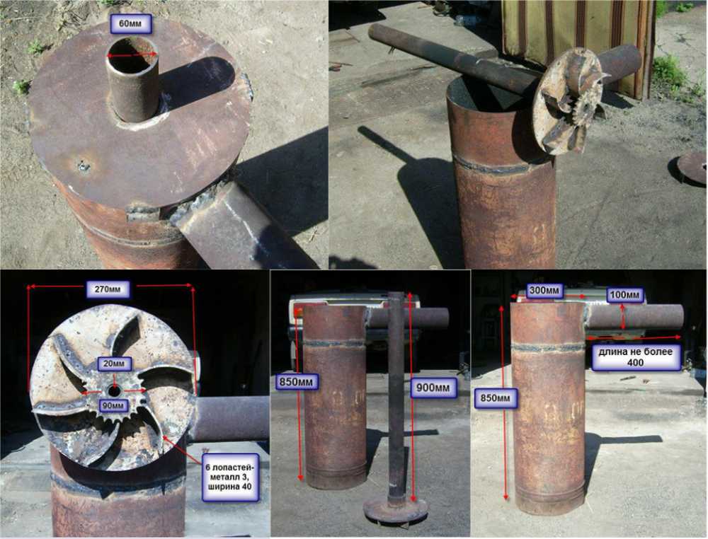 В верхней части сбоку вырезается отверстие под дымоход. К нему тут же приваривается труба диаметром 100 мм и длиною 20-40 см.