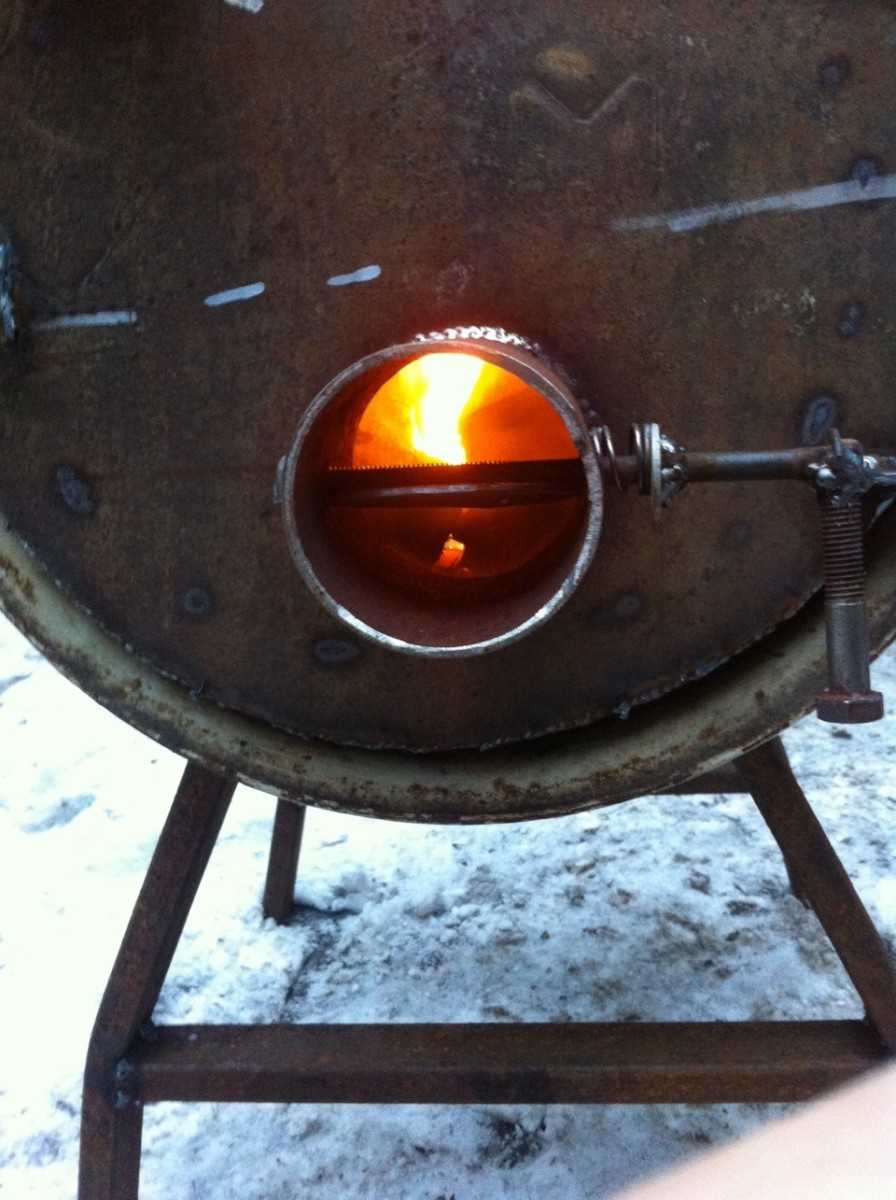 Топливо сгорает не в полном объеме, поскольку через отверстия поступает воздух. Окончательно газы выгорают внутри трубы.