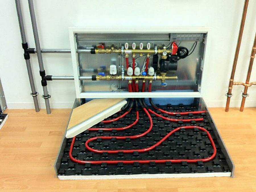 Коллектор устанавливают в специальный ящик, имеющий толщину стенок около 12 см. Подбирая размеры ящика, следует учитывать всю коллекторную группу: сливы, воздуховоды и датчики давления. Размещать ящик рекомендуется немного выше, чем система теплого пола, чтобы выход труб находился внизу. Такое расположение обеспечит полноценный воздухоотвод .